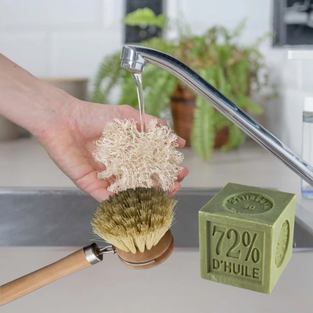 - Passo 2: Utilizando a escova de limpeza de bambu, aplique o sabão no recipiente e na tampa.