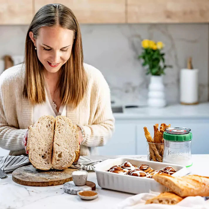 Use o pote versátil para armazenar o seu fermento com segurança, para que ele esteja sempre pronto para fazer pão. Para garantir que o seu fermento nunca fique sem alimentação, use o cronômetro de fermentação para registrar o horário da última alimentação. Se optar por armazenar o seu fermento em temperatura ambiente, alimente-o diariamente; Se refrigerado, alimente uma vez por semana.